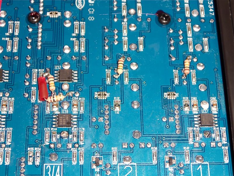 最初にch 5/6 ,3/4の方から IC12 , IC13がイコライザの回路でその隣にAuxVRの中点があります。この中点から下に配線がのびてR155-R154 or R156-R157 のチップ抵抗がありその先にフェーダoutにつながっているらしい。このチップ抵抗を外して、IC12,13のすぐ下にある2個の四角いランドがイコライザからのカップリングコンデンサ出力側とVR中点を抵抗ミックスします。配線が近過ぎで結構面倒です。1/4wでは大き過ぎですね。芋半田になってしまった。1/6wの抵抗が欲しかった。